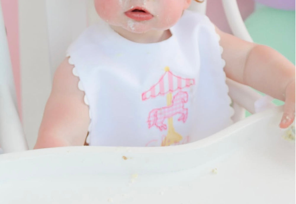 Scalloped ONE in Pink Swiss Dot